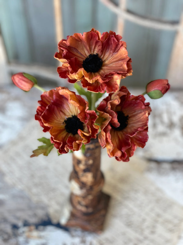 “Pop” is an understatement regarding this real-touch bundle of poppy blooms and buds!  Two skirts of creased petals make up the blooms.  Each bundle contains 5 stems bound with a raffia...