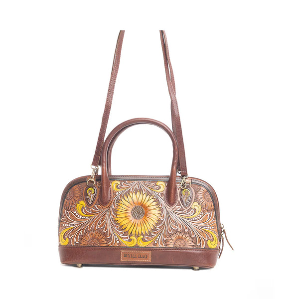 This bag is a showstopper! You'll adore its beautiful hand-tooled leather, which features a traditional Western pattern ablaze with prairie sunflowers. It's accented perfectly with rich bourbon brown leather. Zipper...