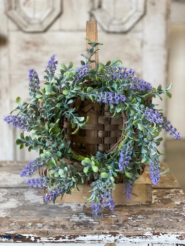 Dense lightly flocked boxwood greenery is graced with spires of purple blooms.   12" | 4.5" inner materials: plastic, natural twig base Other decorations sold separate