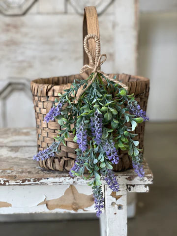 Dense lightly flocked boxwood greenery is graced with spires of purple blooms.   materials: plastic, paper wrapped wire stems, twine wrapped bow/hanger