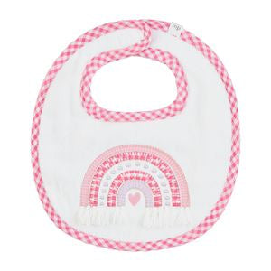 Appliqued velour terry cloth bib with contrast gingham binding and hook and loop closure.
