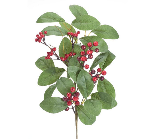 Pick/spray with red berries and green leaves.Made of foam, poly silk and plastic.14" H x 11" W x 3 1/2" D.25" H overall