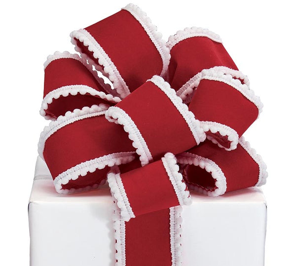 Red velvet ribbon with white snowball edging.2.5" Wide x 20 yd Roll.
