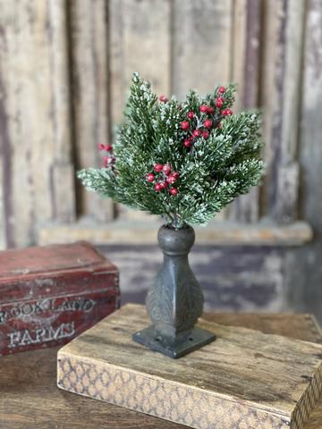 A lovely mixture of pine and red berries with a light dusting of snow. materials: plastic, styrofoam berries