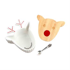 2-piece set. Hand-painted ceramic candy dish with engraved wood lid. Comes with stamped silverplate spoon.