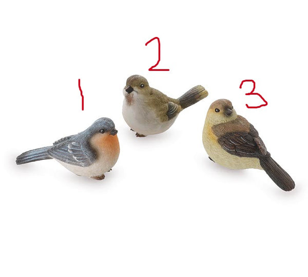 Assorted bird figurines. Colors include: blue bird, brown/tan/cream bird, and blended tan cream bird.Made of hand painted resin.2 1/2"H X 4 1/4"W X 2"D