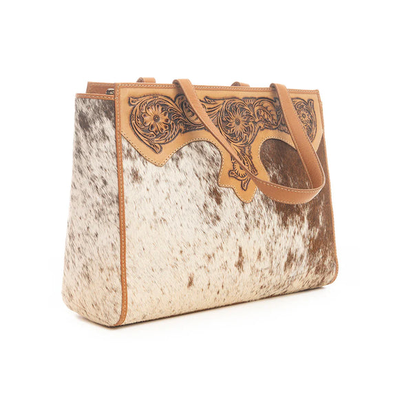 This exquisite tote bag offers a stunning combination of craftsmanship and natural beauty. It features a beautiful combination of treatments – beautiful hair-on hide paired with hand-tooled leather in a...