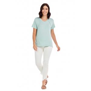 Jersey knit V-neck t-shirt features raglan exposed seam details and oversized fit.