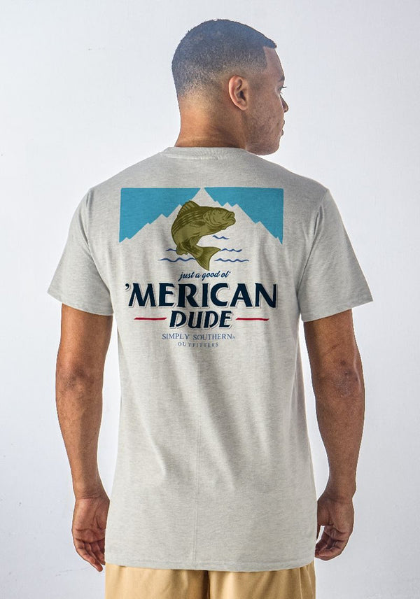 Description Light gray short sleeve with the phrase 'Just a good ol' 'merican dude' and a large bass and mountains in the background. Simply Southern logo below. Simply Southern logo...