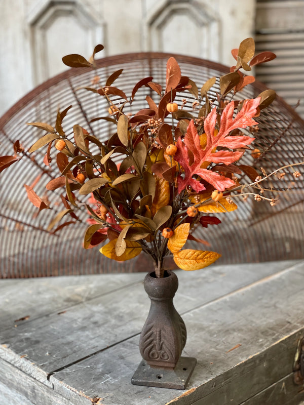 A striking collection made up of a symphony of fall toned leaves, bubble berries, and miniature pumpkins on branching stems. materials: eva, polyester, styrofoam berries and pumpkins, wire, paper wrapped stem...