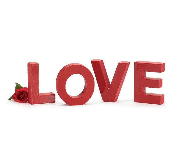 Red wood L O V E letters shelf sitter with lacquer finish on the front.4"H x 2.75"W x 1"D4"H x 3.5"W x 1"D4"H x 4"W x 1"D