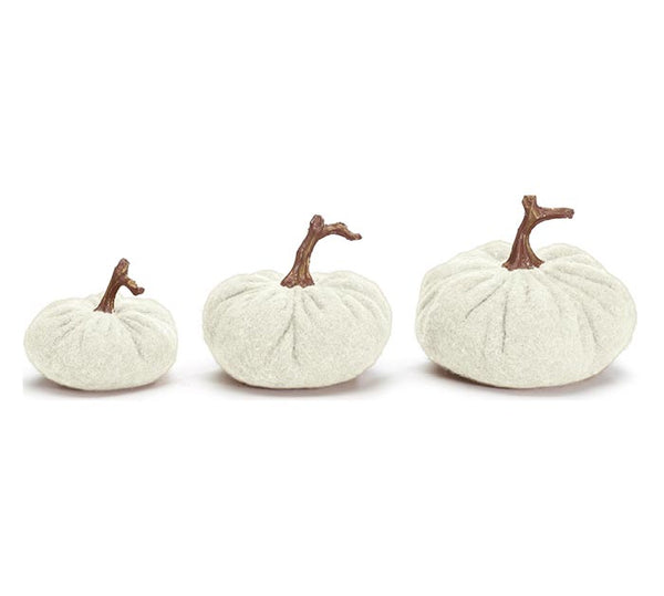 Cream color soft wool pumpkins with plastic stems in 3 sizes.Made of fabric, plastic and sand.Large: 8 1/2" H x 8" Dia.Medium: 6 1/2" H x 6 1/2" Dia.Small: 6"...