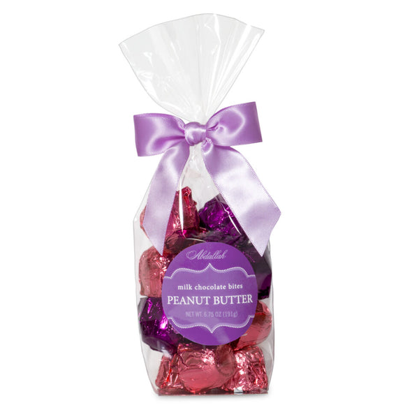 Smooth peanut butter center in a milk chocolate shell, foiled in violet and light pink 6.75 oz. bag