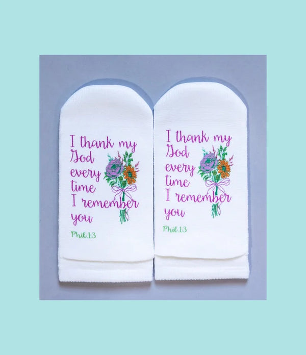 Standing on the Word Socks Flowers with verse: Philippians 1:3 thank my God