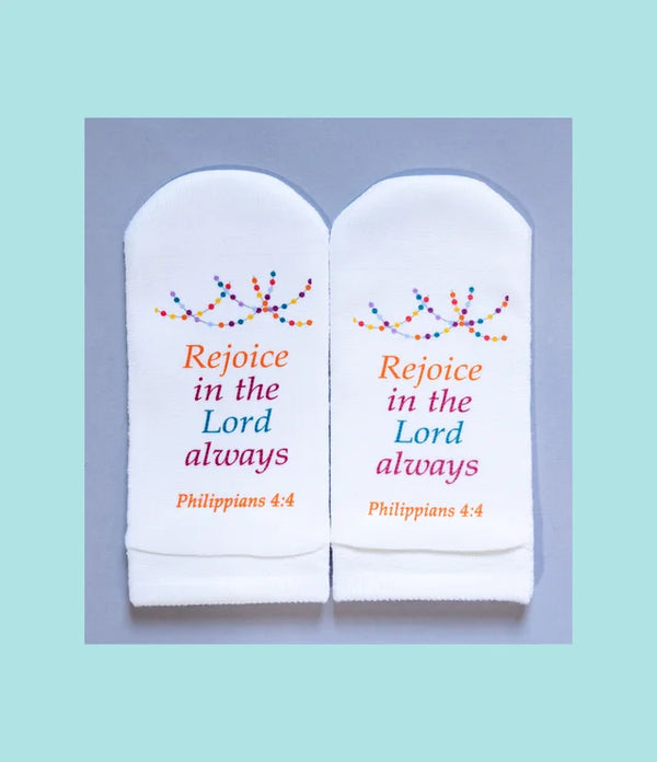 Standing on the Word Socks Pompom with Verse: Phil.4:4 Rejoice in the Lord always