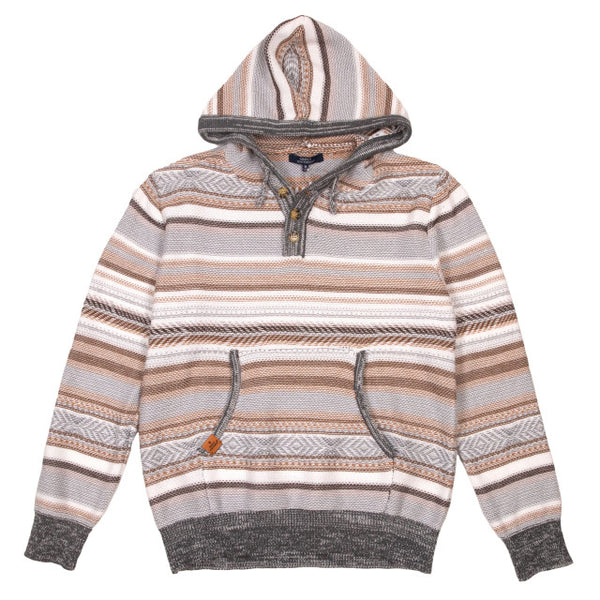 This striped sweater hoodie features a front button closure, drawstring, kangaroo pocket, and a ribbed hem and cuffs.