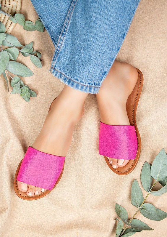Comes in whole sizes. If you wear a whole size we recommend sizing up. Strap is a faux leather with a cushion sole.
