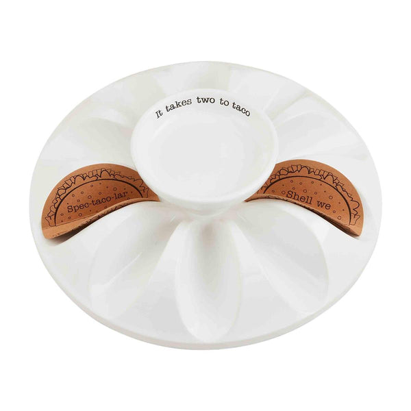 Ceramic platter features dimensional grooves to hold taco shells upright and center dip bowl. 3" x 12" Dolomite