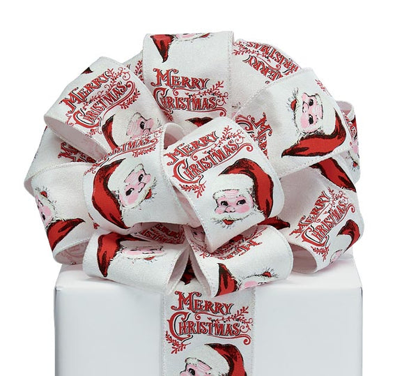 white ribbon with vintage Santa face and "Merry Christmas". Has hints of iridescent glitter and sewn wired iridescent edge.2 1/2"W X 20 yards.Roll.