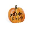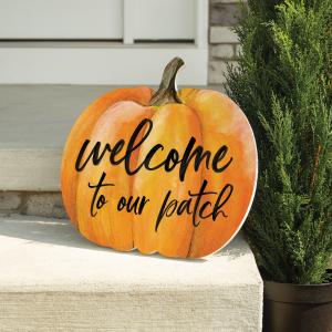 Add this fun, shaped décor to a front porch, covered patio, or entryway. Features the iconic pumpkin shape, bright colors, and a welcoming sentiment. Includes an easel for angled display....