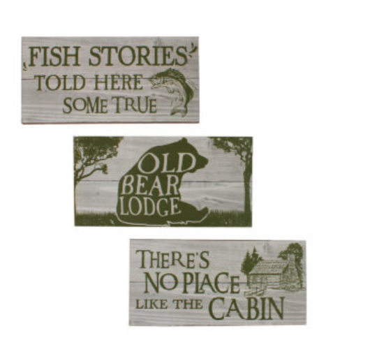 Adorable wood wall décor. One says, " There's no place like the cabin" The second one says, "fish stories told here some true." and the third says, "Old bear cabin