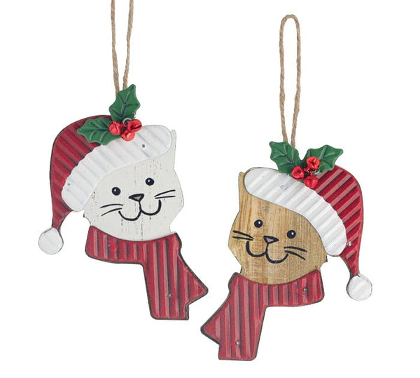Distressed wooden cat head ornaments in white and brown. Both cats are wearing tin Santa hats with holly accents and a scarf.4 3/4"H X 3 1/2"w